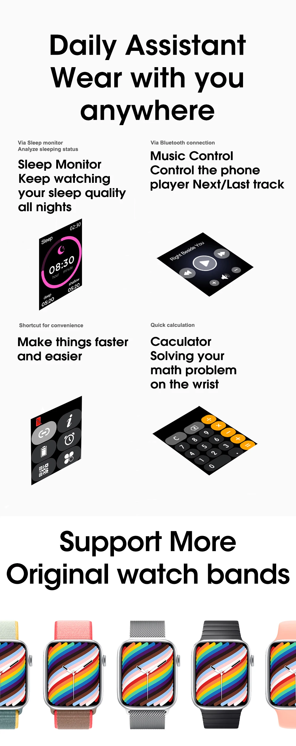 - Watchface download, Split display, Pin lock, Bluetooth call, Heart rate, Pedometer, Multiple Sports, Notifications